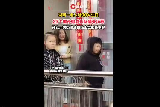 【27个重孙排队给老人磕头拜寿 】10月3日,湖南岳阳,老人过90岁生日,27个重孙排成长队磕头拜寿。
